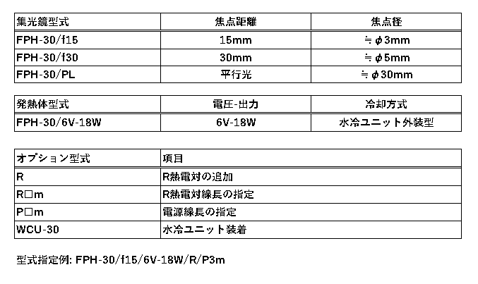 FPH-30は集光鏡とベース付き発熱体を組合せ、電源線の長さを指定して使用します。