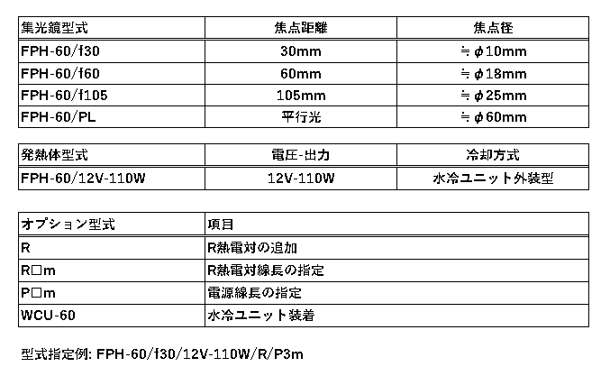 FPH-60は集光鏡とベース付き発熱体を組合せ、電源線の長さを指定して使用します。